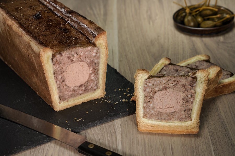 Pâté à base de viande de porc, médaillon rond de mousse de foie de volaille. Croûte croustillante.
